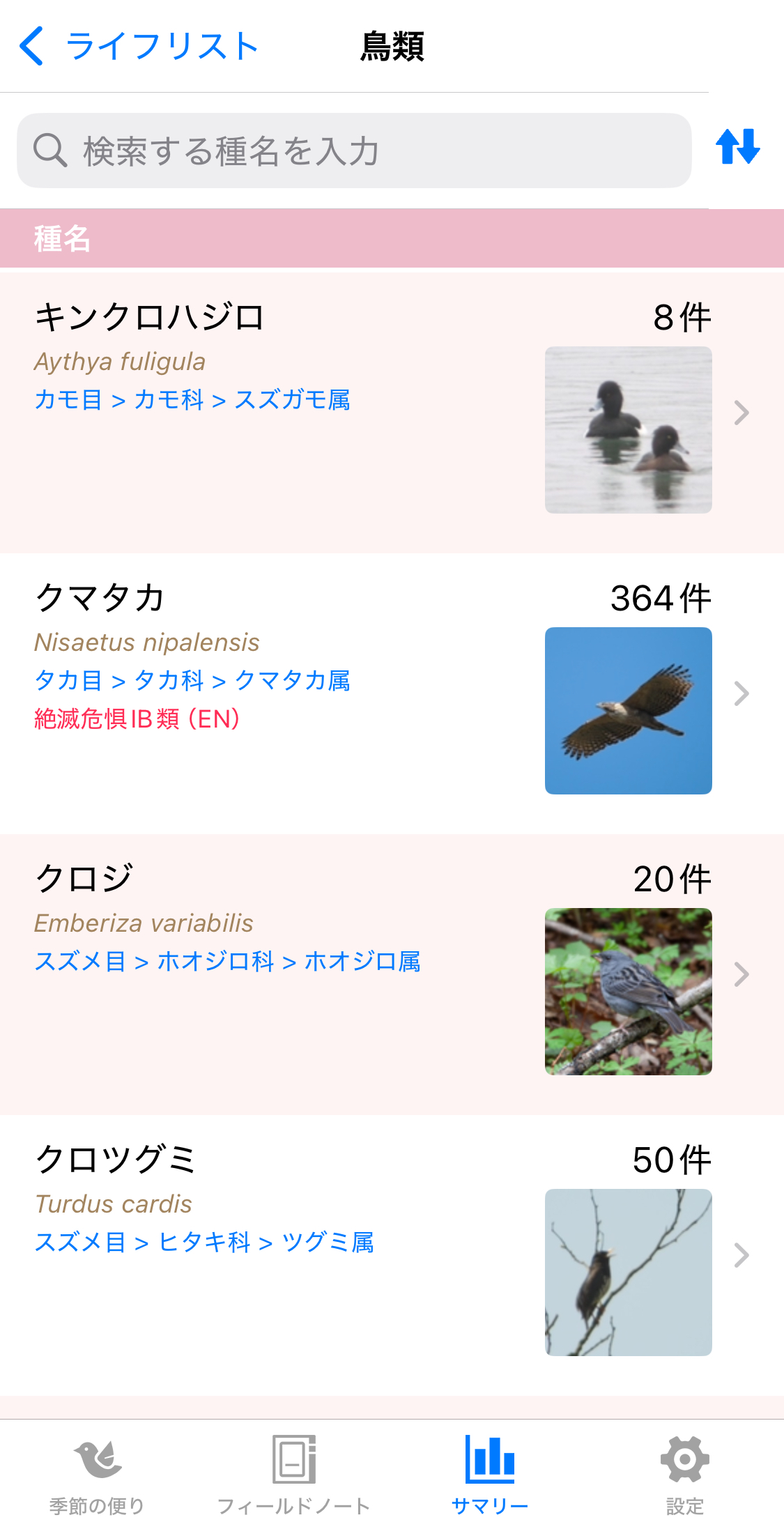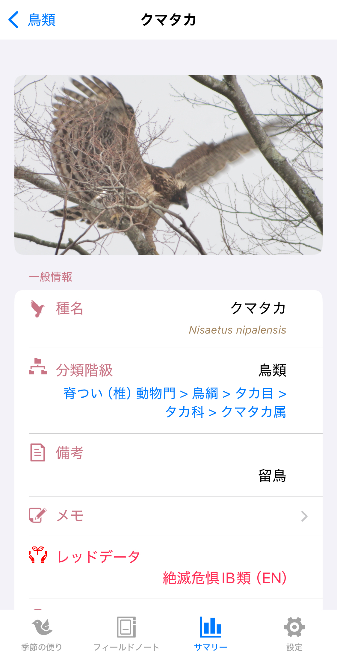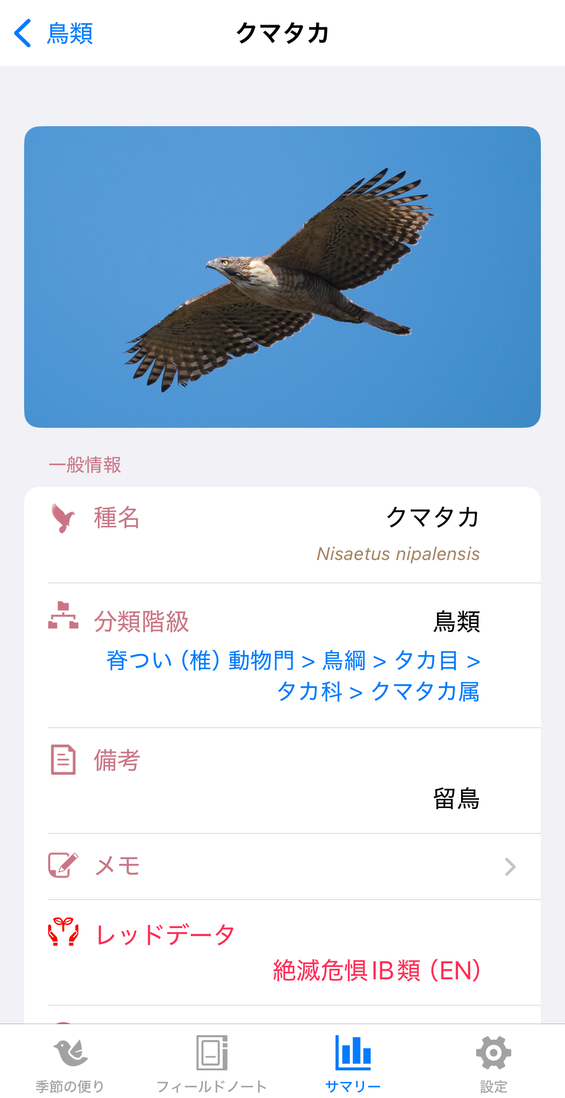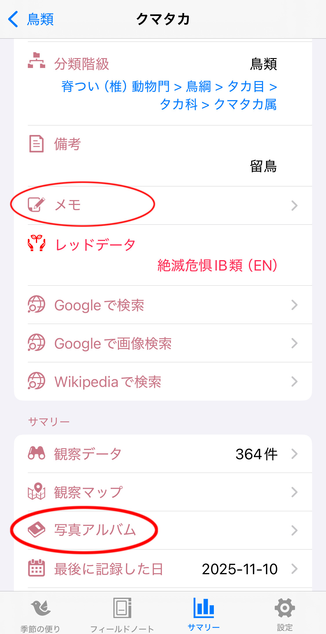 従来ライフリストの代表写真は最後に登録された写真メモが表示されていましたが、代表写真を写真アルバムから任意の写真に設定可能となりました。また、同詳細画面にフィールドノートとは別に独自のメモを追加可能としています。