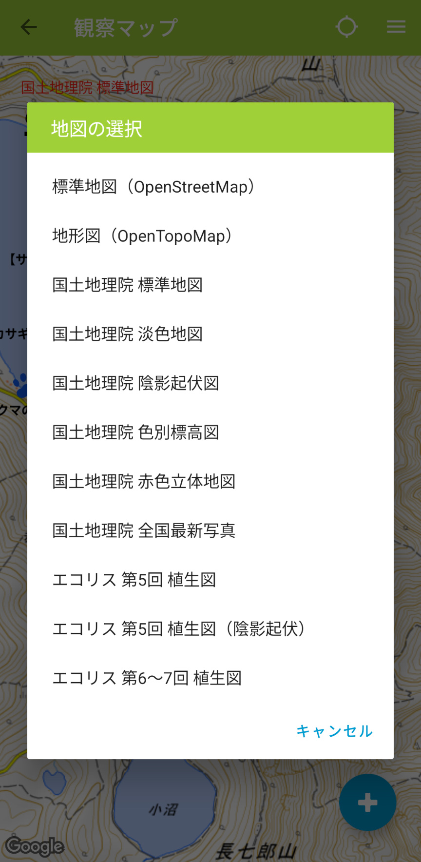 - 観察マップ・マップ検索など地図の種類の選択を地図名タップのトグル式からリスト選択式に変更しました。