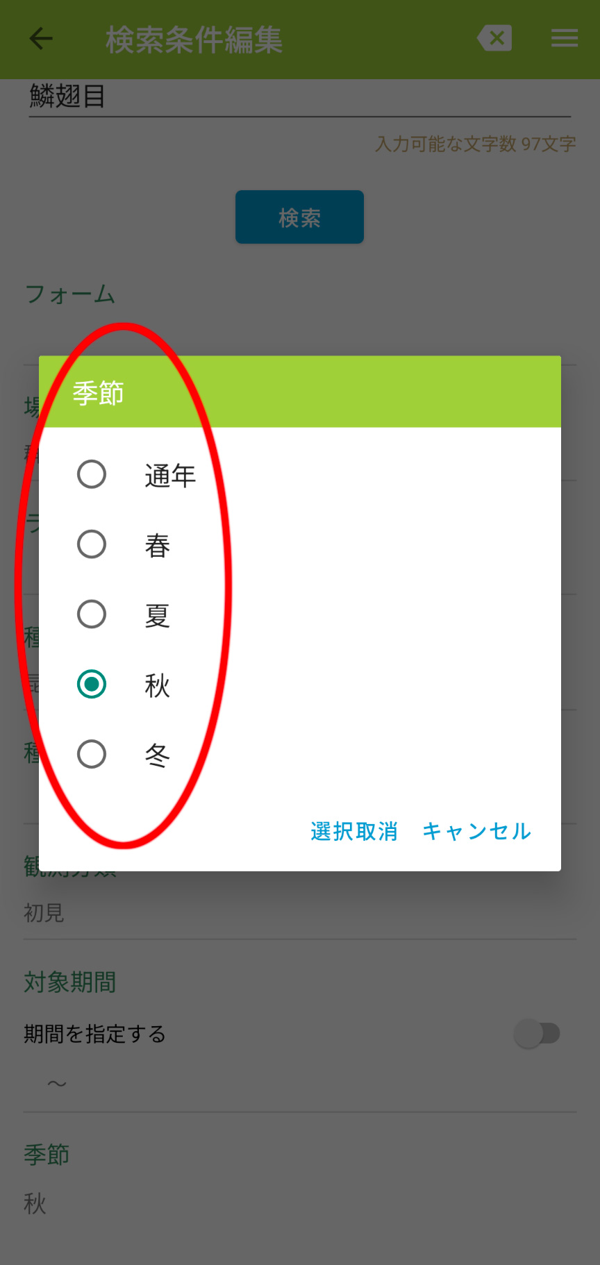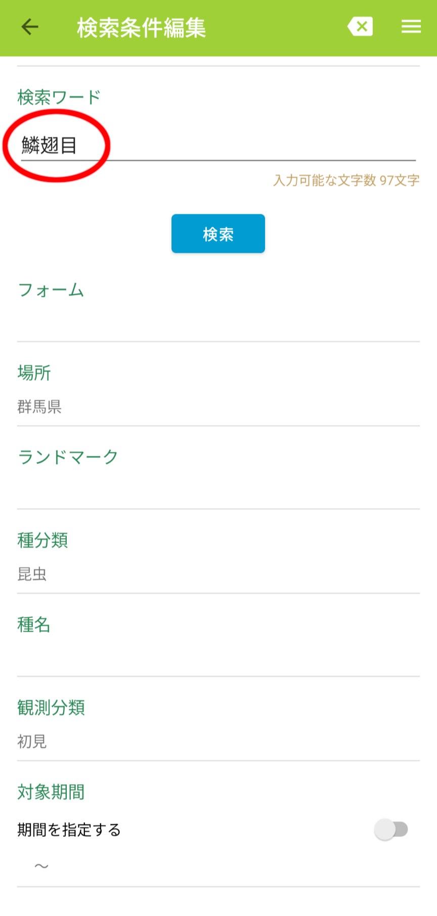 - 検索条件の項目の並び順を見直しました。併せて種分類または種名が指定された場合は観察データのみを検索対象とするようにしました。